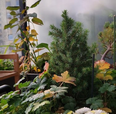 Gyvenu mieste, daugiabutyje, tačiau turiu balkoną ir jame radau vietos sumedėjusiems augalams – dalinuosi augalų sąrašu kuris, žinoma, nėra baigtinis, tačiau galbūt pravers renkantis medelius ir suteikiant stilingai balkono ar terasos zonai dar daugiau jaukumo, estetikos, gyvybės ir gamtos artumo: paprastasis lazdynas 'Contorta'(Corylus avellana L.), švedinis kaulenis 'Coral Beauty'(Cotoneaster suecicus G.Klotz), grauželinė gudobelė 'Paul's Scarlet'(Crateagus laevigata (Poir.) DC), Fortūno ožekšnis 'Emerald Gaiety' (Euonymus fortunei (Turcz.)Hand.-Maz), dygialapė mahonija (Mahonia aquifolium (Pursh) Nutt.), obelis 'Royal Beauty' (Malus spp.), vilnotasis karklas (Salix lanata L.), pilkasis kėnis 'Compacta' (Abies concolor (Gordon et Glend.) Lindl. ex Hildebr.), paprastoji eglė 'Little Gem' (Picea abies (L.) H. Karst), kalninė pušis 'Humpy' (Pinus mugo Turra), vakarinė tuja 'Danica' (Thuja occidentalis L.), kanadinė cūga 'Jeddeloh' (Tsuga canadensis (L.) Carriere), gebenė lipikė (Hedera helix L.), paprastasis apynys (Humulus lupulus L.), penkialapis vinvytis 'Engelmanii' (Parthenocissus quinquefolia (L.) Planch), tanganinė raganė 'Lambton Park' (Clematis tangutica (Maxim.) Korsh), vijoklinis sausmedis 'Serotina' (Lonicera periclymenum L.).